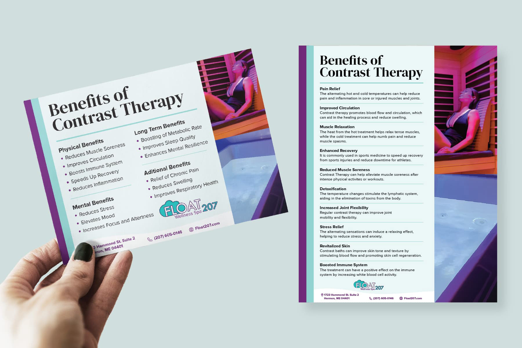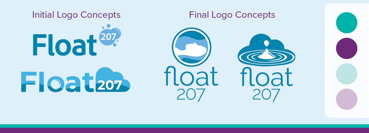 During my time at One Circle Agency, I served as Creative Director for our client, Float 207. Float 207 is a wellness spa located in Bangor, Maine. They specialize in sensory deprivation tanks. Our first task as a team was to come up with some new logo designs. They wanted a modern minimalistic logo that gave of the vibe of ‘floating’. I also took on redesigning some of their older materials and creating a few TikTok videos.